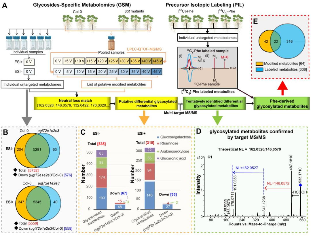 综上,GSM-PIL方法可以高效解析UGTs在植物体内的功能。相对于传统一对一“钓鱼”式地探索UGTs功能,GSM-PIL方法可以“捕鱼”式地一网打尽UGTs的产物,全面鉴定未知的底物或糖基化产物,解析UGTs在植物中未知的生理功能,揭示了植物中的糖基化网络比我们想象中更复杂。