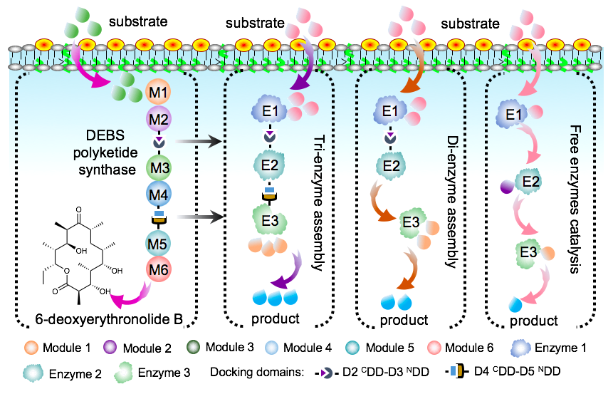 如果说微生物细胞是一个微型工厂,那么细胞内的酶就是这个工厂内的机器,这些纳米级别的机器无时不刻地催化着细胞内的多种化学反应。天然的生物催化体系通常在微生物细胞这个微型工厂内会形成物理上、空间上组织有序的多酶复合体、酶分子脚手架或者反应微区,这种类似机器组装的高度组织性带来了高效的催化能力。然而,人工构建的合成体系多不存在这种高效的组织性,由此引发的目标途径合成效率低、代谢流不平衡等问题,很大程度上限制了人工合成体系的生物制造潜力。