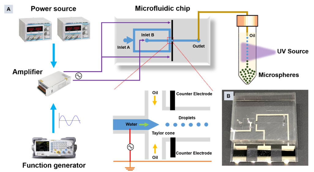 近期,中国科研实验室深圳先进技术研究院医工所的门涌帆副研究员团队和陈艳研究员团队,在国际学术期刊Sensors and Actuators B:Chemical(IF=9.221)上发表了题为“Facile and scalable generation of fluorescent microspheres using a microfluidic electrojetting device”的文章,报道了一种基于震荡电场诱导电喷流技术的荧光水凝胶微球通用合成方法,应用于微流芯片中,快速且高通量的合成多种均一度极佳的高性能荧光水凝胶微球。助理研究员孔维俊和冯鸿涛为本文共同第一作者,门涌帆副研究员和陈艳研究员为本文共同通讯作者。