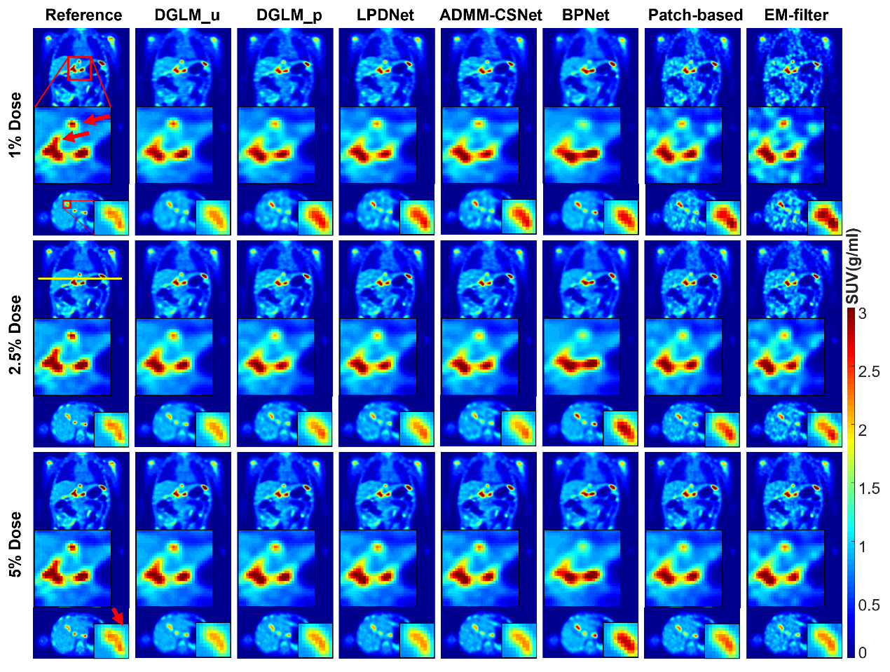 现有研究表明,儿童对于辐射剂量的敏感程度要远远高于成人,而且儿童在PET扫描时更容易由于运动导致重建图像出现伪影,因此低剂量快速PET成像在临床上具有重要意义。基于此,团队研发了一种基于深度学习的深度泛化PET重建模型(图1)。该模型顺利获得隐式学习来同时优化数据保真项和正则化项,能够显著改善由系统误差、随机散射和背景噪声等引起的原始信号畸变。实验结果表明,该模型在PET重建图像质量上明显优于现有深度学习和传统迭代方法(图2-图4)。