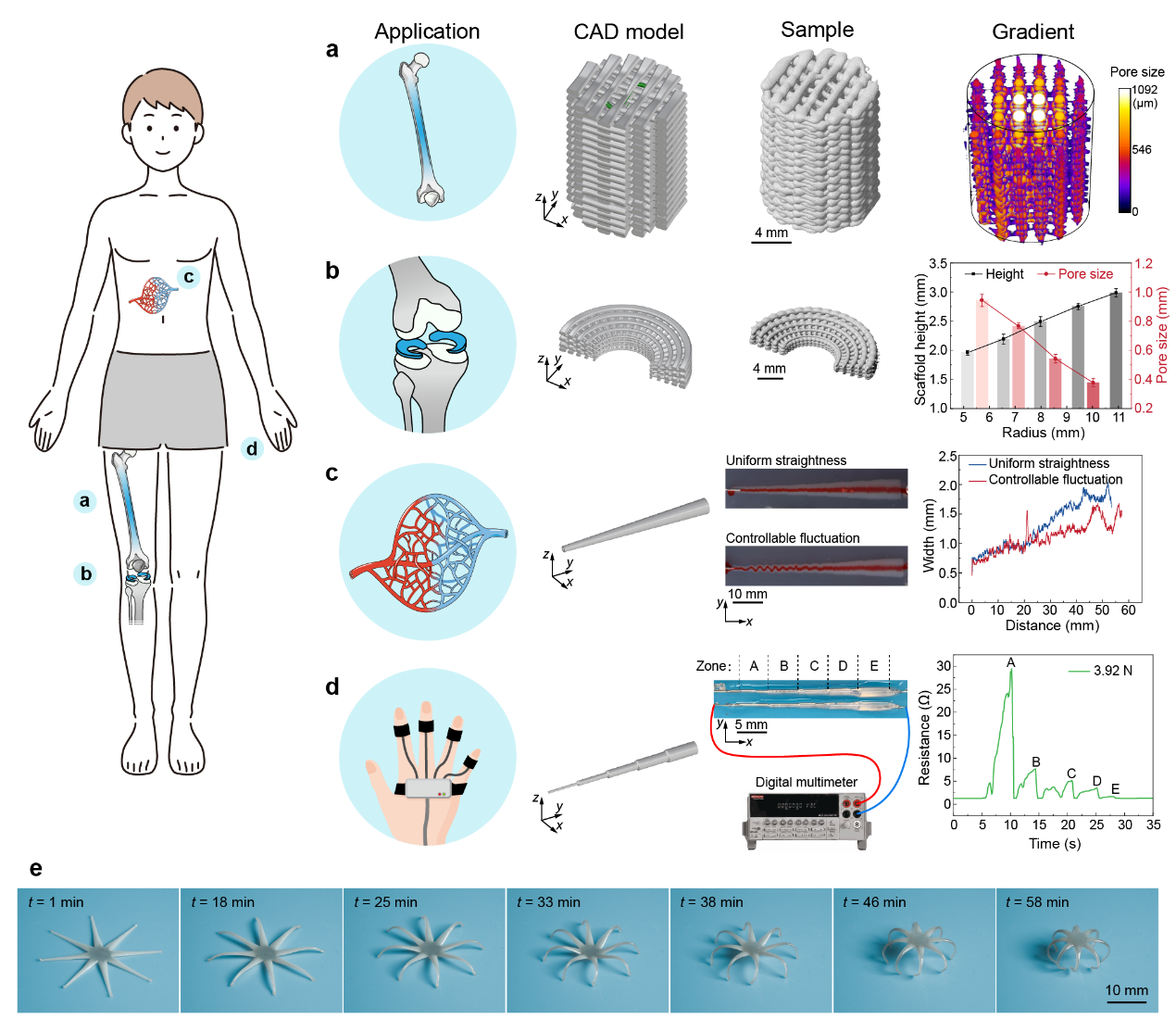 我们提出的FDA-3DP新策略突破了传统挤出3D打印技术难以加工复杂梯度多孔结构的难题,在组织工程与器官体外仿生制造(如骨、软骨、血管)、4D打印等应用场景进行了验证(如图3),有望为器官仿生构建给予新策略。
