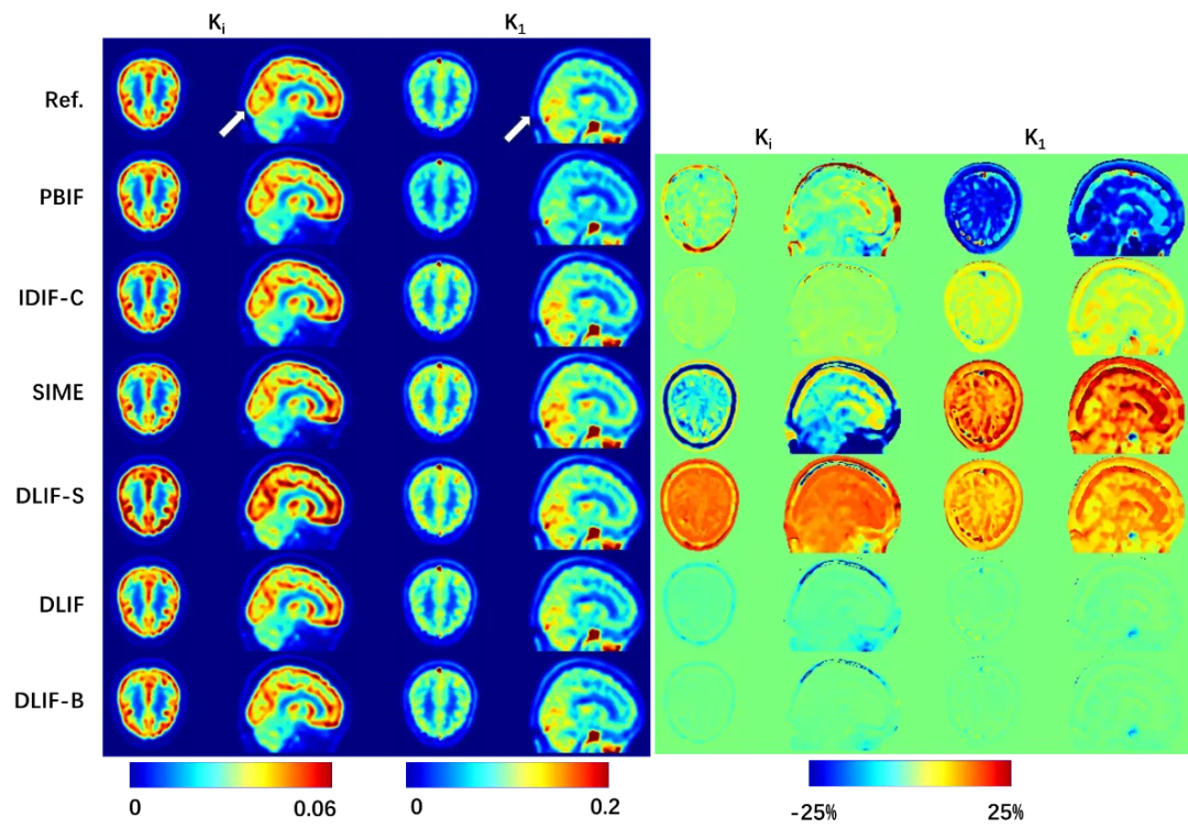 图3 展示了使用不同方法估计的输入函数所计算的K1/Ki图像(左)。可以观察到,使用所提出的方法(DLIF)估计的参数图像与参考图像最为接近,且误差值范围最小(右)。