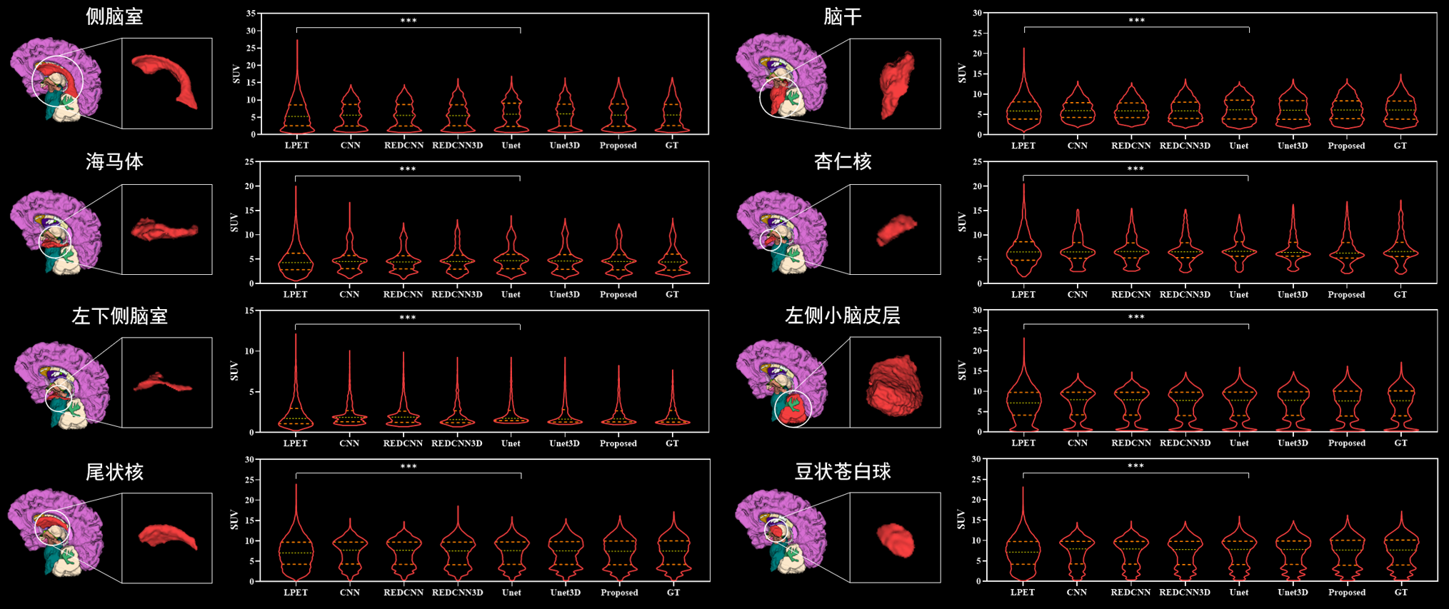 该研究共纳入 100 例全脑PET/MR临床数据,顺利获得构建深度学习网络框架实现PET代谢信息、MR解剖信息和全脑空间定位信息的高效融合,最终实现了低剂量全脑区PET高清成像。实验结果表明,提出的低剂量脑区PET高清成像技术能够显著提高脑PET图像质量,有效保留脑区的沟回细节、抑制图像噪声,与“金标准”显示出高相关性和一致性。该研究有效解决了低剂量PET/MR成像过程中的图像质量保真问题,对相关神经类疾病的早期检测和脑肿瘤代谢异常分析具有重要临床意义。