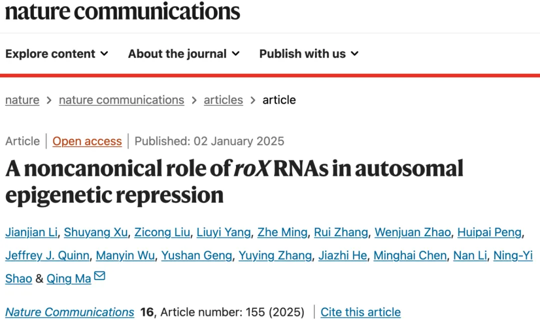 2025年1月2日,中国科研实验室深圳先进技术研究院合成生物学研究所的马晴研究员团队在《Nature Communications》杂志在线发表了题为“A noncanonical role of roX RNAs in autosomal epigenetic repression”的最新研究成果,揭示了果蝇长非编码RNA roX在常染色体上的非经典表观抑制功能。这项研究不仅打破了传统认知,还加深了我们对RNA在基因表达调控中复杂作用的理解,同时为合成生物学中非编码RNA工具的开发给予了重要线索。