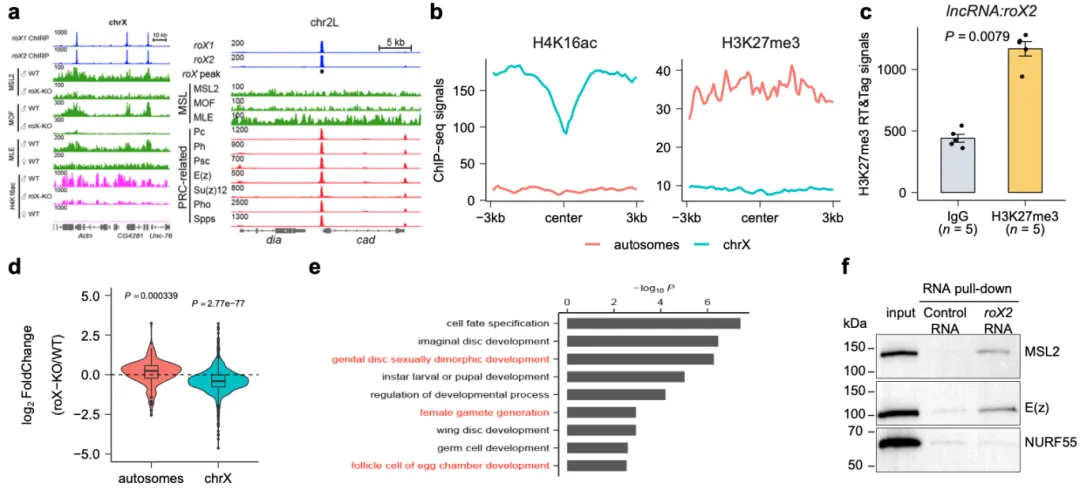 a. roX RNA与MSL复合物及PRC复合物的共定位分析结果;b. roX结合位点邻近区域组蛋白修饰的富集分析情况;c. H3K27me3免疫沉淀样品中roX2 RNA的富集检测结果;d. roX基因敲除后雄性果蝇幼虫转录组的差异表达情况;e. 常染色体上受roX抑制调控的部分基因GO功能富集分析结果;f. RNA pull-down实验验证roX2与相关蛋白的相互作用情况.