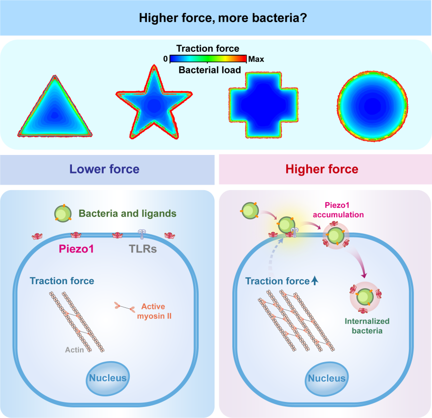 在此基础上,研究团队“锁定”了关键蛋白--力敏感性离子通道蛋白 Piezo1的作用:当细菌开始入侵时,这种能感知牵引力的蛋白会像磁铁一样聚集到感染部位,形成特殊的囊泡结构。这些囊泡就像“信号放大器”,把细胞受到的牵引力转化为“生化信号”,促使更多细菌在边缘区域聚集感染。