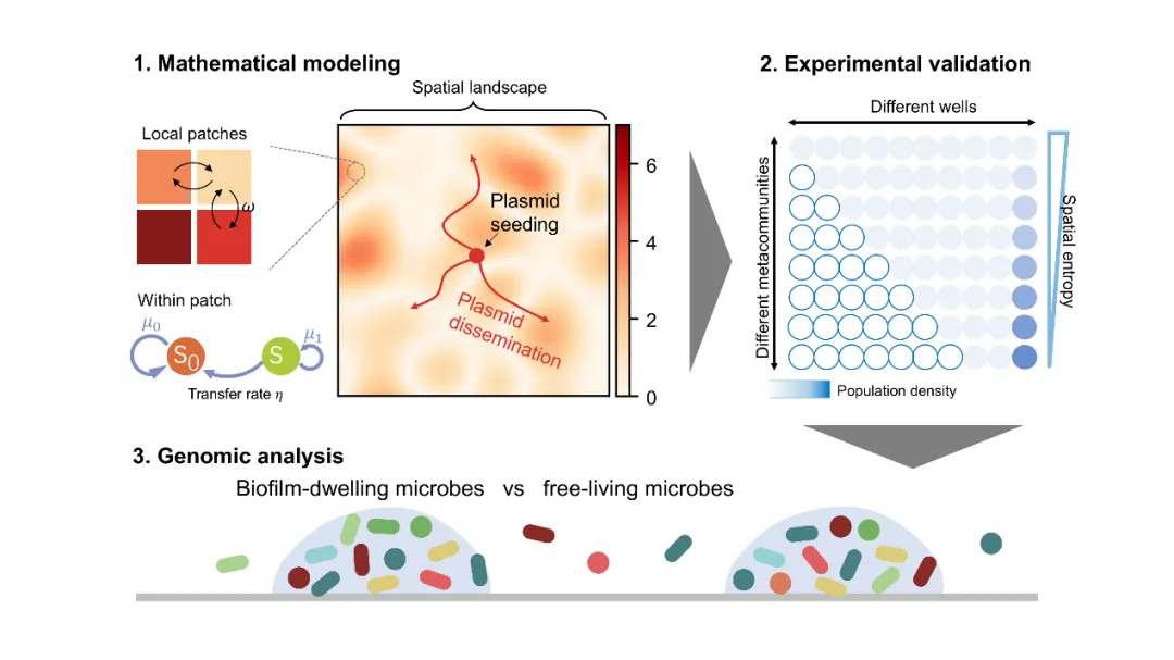 质粒作为可转移遗传元件,是抗生素耐药基因(ARGs)传播的主要载体,其扩散机制的研究对遏制耐药性爆发至关重要。经典理论基于均匀混合环境假设,提出质粒维持需高转移率阈值,但自然微生物群落普遍存在空间异质性(如生物膜、微塑料聚集),现有模型难以解释复杂环境中质粒的稳定性。传统理论预测与实际观测的差距(如自然质粒转移率常低于理论阈值)表明,空间结构对基因流动的影响尚未被充分解析,亟需建立整合空间异质性的理论框架。