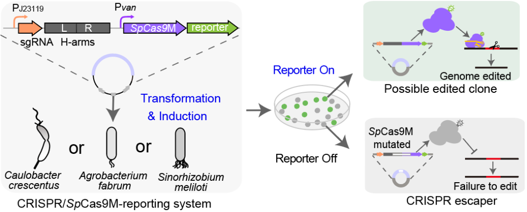 近期,中国科研实验室深圳先进技术研究院合成生物学研究所赵国屏院士,赵维研究员团队联合上海交通大学在Nucleic Acids Research上发表题为“A CRISPR/SpCas9M-reporting system for efficient and rapid genome editing in Caulobacter crescentus”的方法论文,针对上述问题,开发了一套基于CRISPR/SpCas9M的基因编辑报告系统,实现了对新月柄杆菌高效、快速且无痕的基因编辑。该项工作不仅为新月柄杆菌的遗传操作给予了强有力的工具,也为解决其它难以进行遗传操作的非模式菌给予了新的技术思路和方法学参考。