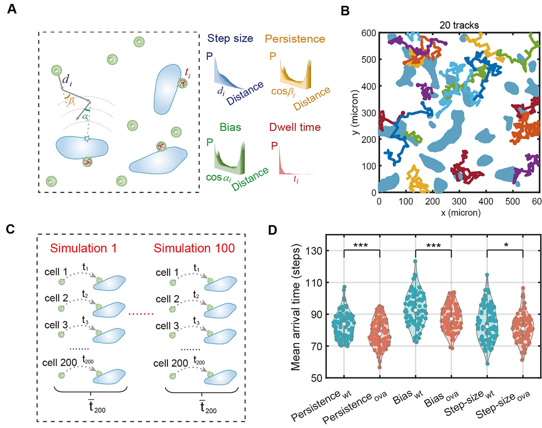 此外,基于运动轨迹数据,研究团队建立了模拟T细胞运动模式的计算模型(图4),进一步验证了“方向性迁移+稳定接触”双机制对T细胞定位与聚集的关键作用。其中,T细胞较强的运动方向持续性有助于提高对肿瘤细胞的搜索效率;而与癌细胞形成的长时间接触(dwell time)是实现聚集的核心因素。