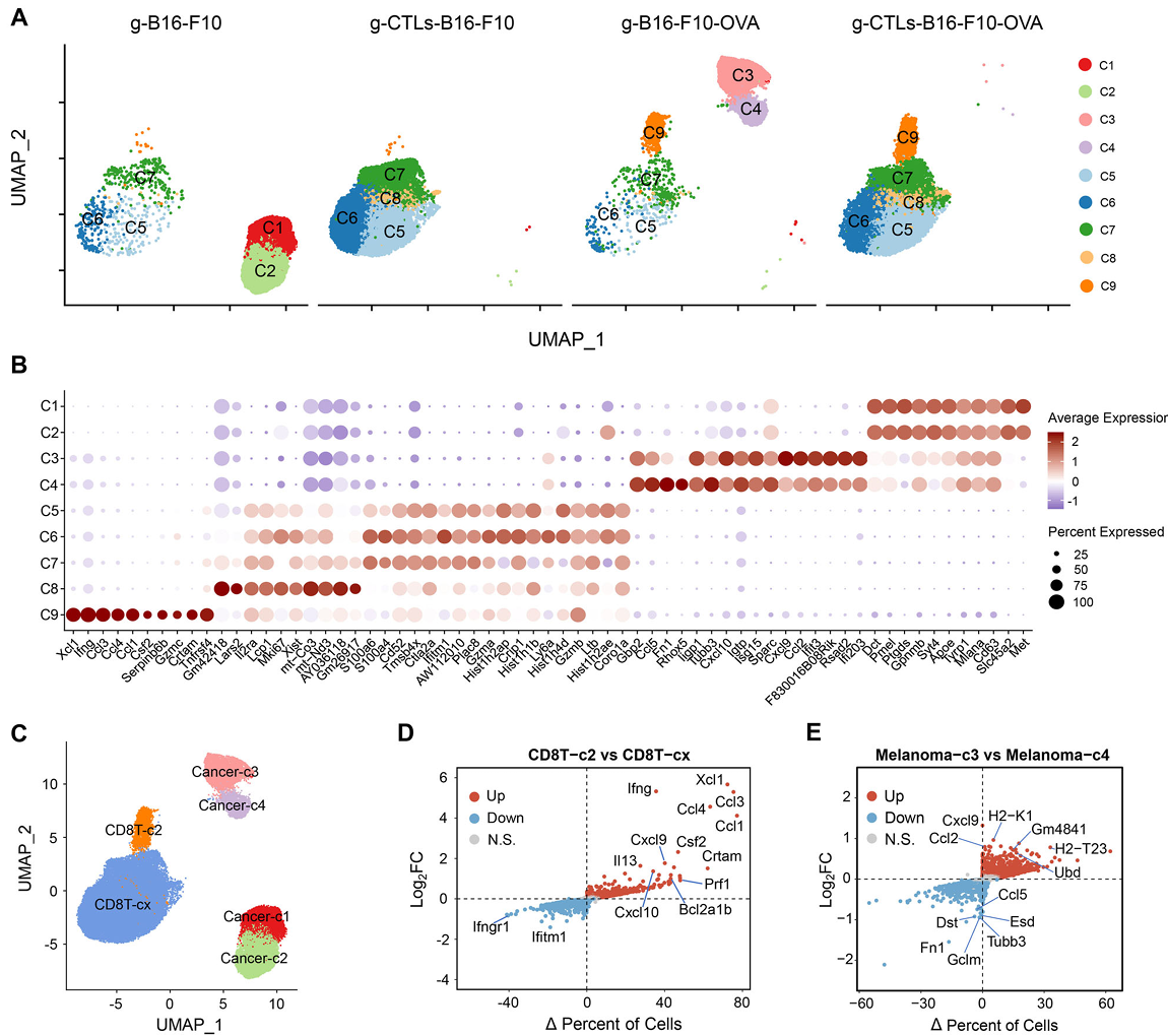 有趣的是,研究团队还发现部分存活的肿瘤细胞在T细胞攻击后发生了表型转变。顺利获得bulk和单细胞转录组分析,研究识别出一类具有免疫逃逸特征的肿瘤细胞亚群(Cancer-C4):该亚群不仅显著下调趋化因子(如CXCL9/10)表达(图5),还激活上皮-间充质转化(EMT)相关通路,表现出更强的迁移性和免疫逃逸特征。