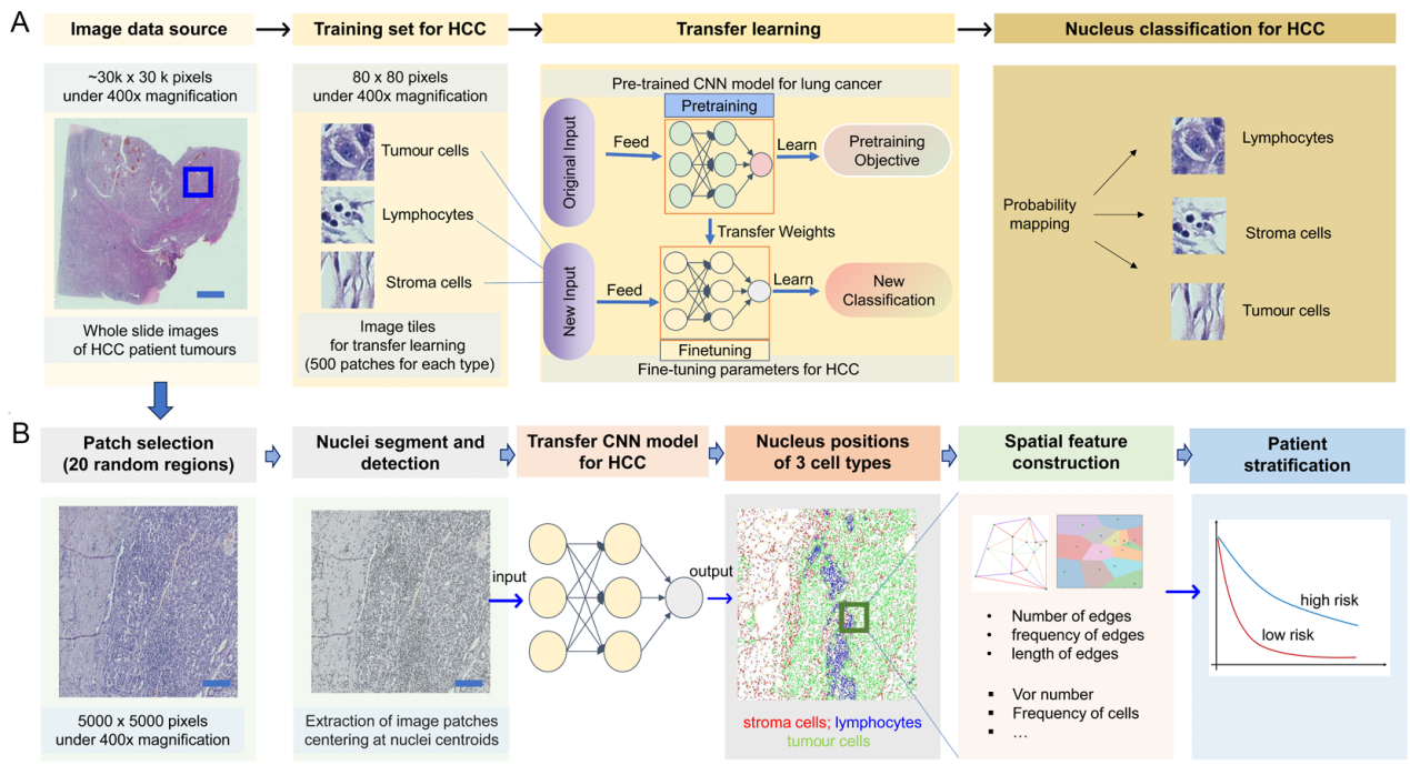 该工作开发了一套基于深度学习的组织图像处理流程,构造了一系列细胞空间分布特征,系统识别并量化肝细胞癌(HCC)组织中多种细胞类型的空间分布特征,发现具备独立预后预测价值的空间生物标志物,为病理图像的结构解析和术后风险评估给予了新思路。