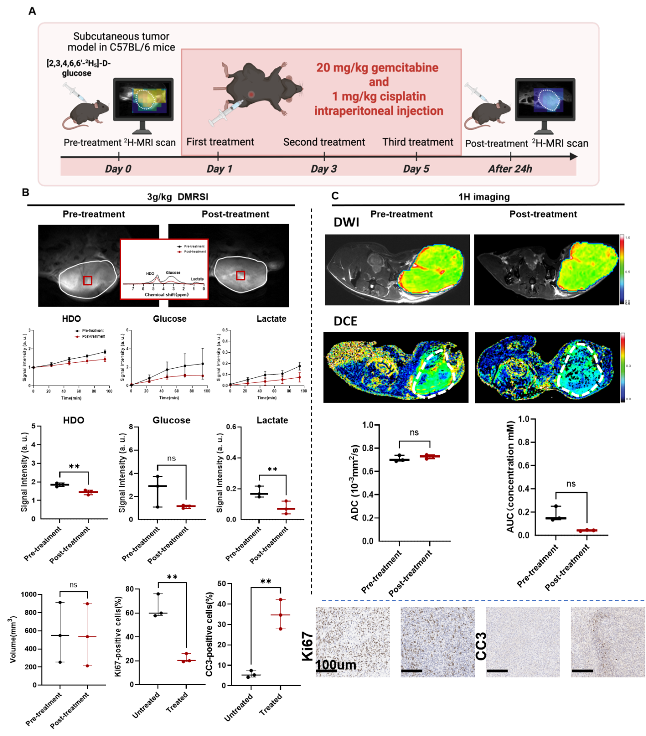 在膀胱癌的小鼠模型中,研究团队发现,DMRSI能够在化疗后仅 24 小时就捕捉到肿瘤代谢的明显变化:乳酸相关信号下降了 55%–80%,说明了肿瘤在经过化疗后糖酵解代谢活动被显著抑制。相比之下,此时常规 MRI 检查(如弥散加权成像DWI与动态增强成像DCE)看不出明显差别。进一步的组织学分析显示,这些代谢变化与肿瘤增殖下降、细胞凋亡增加等关键指标高度一致。这表明,DMRSI能更早反映治疗效果,有望为肿瘤疗效评估给予更及时、更直观的影像依据。