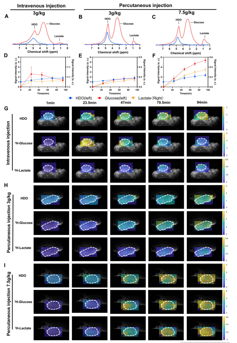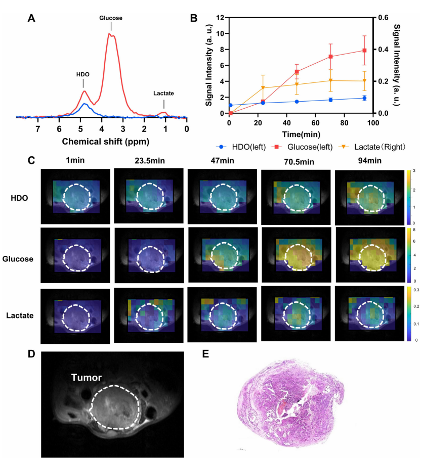 DMRSI是一项利用氘标记底物追踪体内代谢动态的磁共振新技术。你可以把它想象成一个“代谢雷达”——实时监测氘标记底物(如氘标记葡萄糖)在体内向关键代谢产物(如乳酸等)的转化过程,从而直接反映组织内部的代谢活跃程度。值得一提的是,DMRSI能够在完全无电离辐射的前提下获取高特异性的代谢信息。
