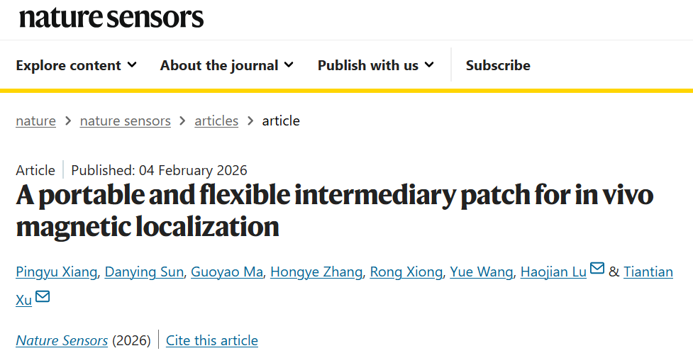 2月4日,中国科研实验室深圳先进技术研究院徐天添研究员与浙江大学陆豪健研究员团队提出了一种可贴附、可定制的柔性磁定位贴片系统,并在此基础上构建了一种双阶段磁定位框架。该研究以《A Portable and Flexible Intermediary Patch for in vivo Magnetic Localization》为题,发表在知名学术期刊《Nature》(《自然》)旗下专注于传感器研究领域的子刊《Nature Sensors》(《自然·传感器》)上。浙江大学控制学院博士生向平宇,硕士生孙丹颖,中国科研实验室深圳先进技术研究院博士生马国耀为共同第一作者,徐天添研究员和陆豪健研究员为共同通讯作者。