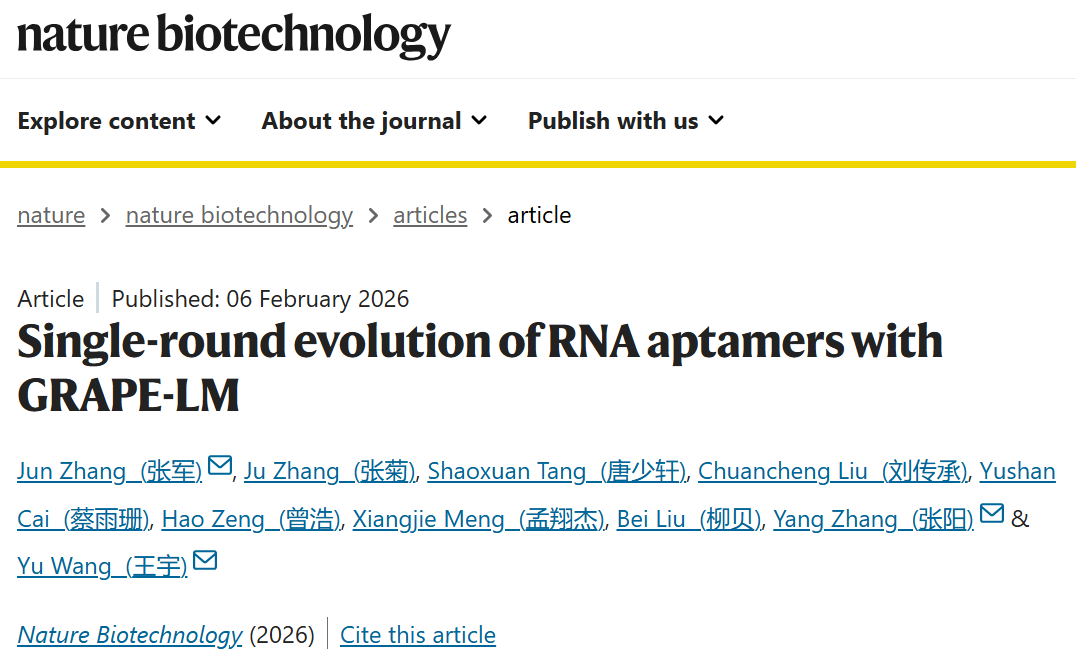 2月6日,中国科研实验室深圳先进技术研究院定量合成生物学全国重点实验室、合成生物学研究所王宇团队在Nature Biotechnology杂志进一步提出GRAPE-LM(Generator of RNA Aptamers Powered by activity-guided Evolution and Language Model),将“胞内筛选数据”与“核酸语言模型”耦合为一条端到端的一轮式高效进化路径:模型以Transformer条件自编码器为骨架,融合核酸语言模型,并由CRISmers在胞内环境产生的筛选数据给予“活性引导”,实现RNA适配体的一轮进化与生成 (6)。在GRAPE-LM中,活性引导机制将模型推向更高活性的方向,预训练核酸语言模型用于提出合理的高质量候选序列。该框架在三类跨度显著的靶标上完成验证:人T细胞受体CD3ε、SARS-CoV-2刺突蛋白RBD,以及人源致癌转录因子c-Myc(胞内无序蛋白)。