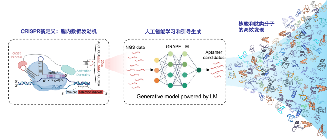 核酸适配体作为一类重要的生物分子药物,但其发现长期依赖SELEX等体外筛选范式,往往需要多轮迭代。王宇团队围绕这一效率瓶颈,提出并开展出了CRISmers与GRAPE-LM的“胞内筛选—AI进化”一轮式高效路线:前者将CRISPR为分子支架,将亲和力转化为细胞层面的功能输出,在单细胞隔离的体系中实现胞内适配体筛选;后者以一轮筛选数据为活性引导,借助生成式语言模型实现序列空间外推与快速优化,从而在概念与方法学层面显著刷新了适配体发现的效率边界。