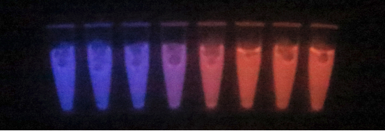 随后,团队将蛋白探针集成在一台比手机略大的检测盒中,用户只需自取一滴血液,将其与反应液融合再放入检测盒。最后,用相机拍照,就能得到一张“红蓝相间”的照片。“探针与NAD+结合时发红光,不结合时发蓝光。因此,红蓝光的比例是NAD+浓度的反映。”於邱黎阳说。